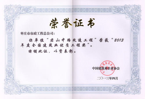“君山中路改造工程”榮獲“2013年度全國建筑業優質工程獎”