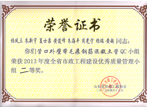 “管口外壁帶毛痕鋼筋混凝土管”QC小組榮獲2013年度全省市政工程建設優秀質量管理小組二等獎
