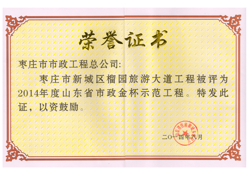 “棗莊市新城區(qū)榴園旅游大道工程”被評為2014年度山東省市政金杯示范工程