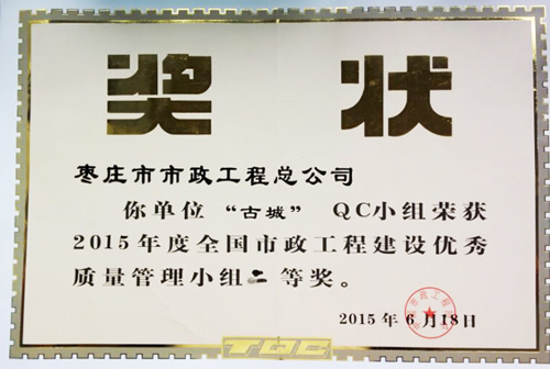 “古城”QC小組榮獲2015年度全國市政工程建設優(yōu)秀質量管理小組二等獎