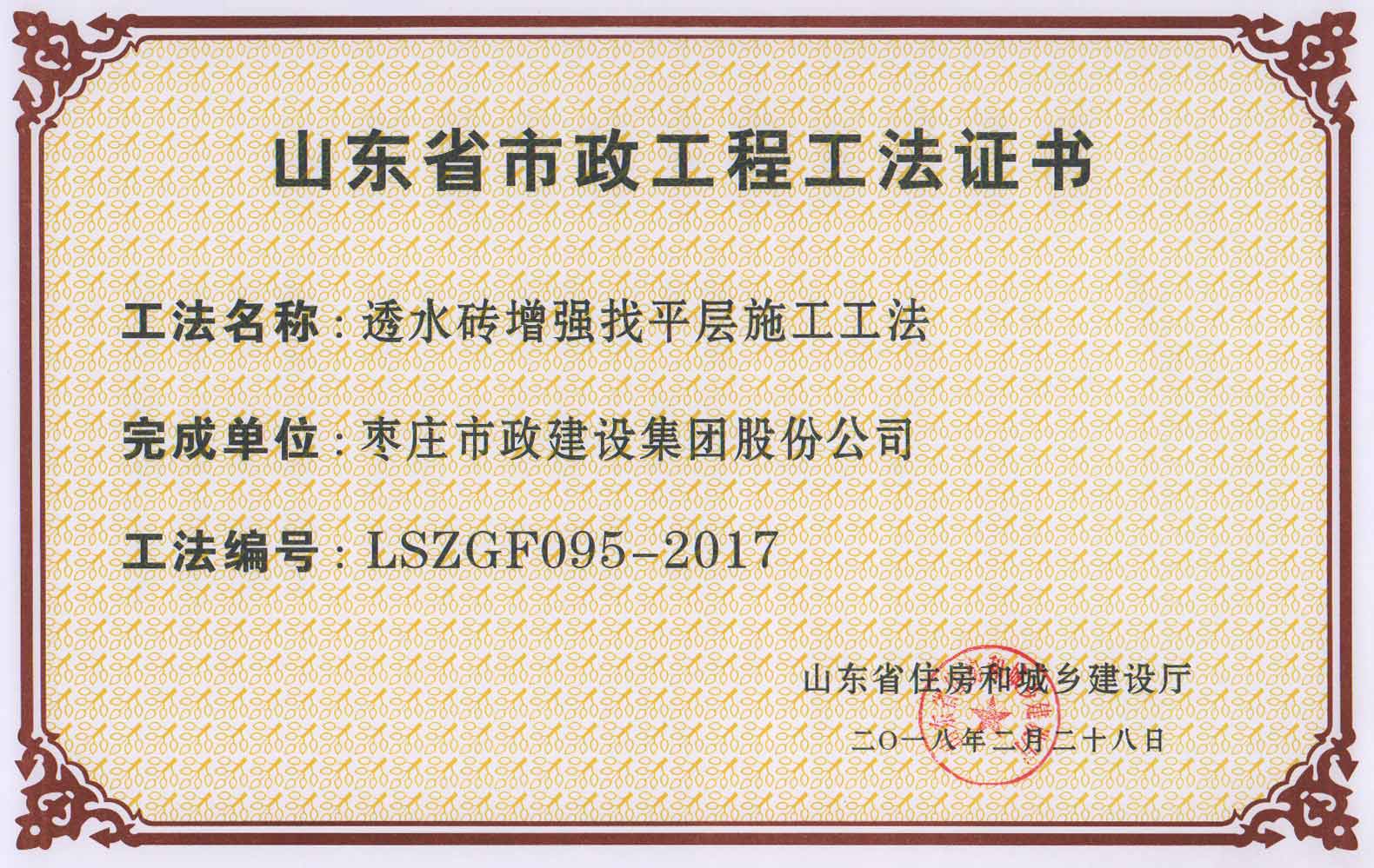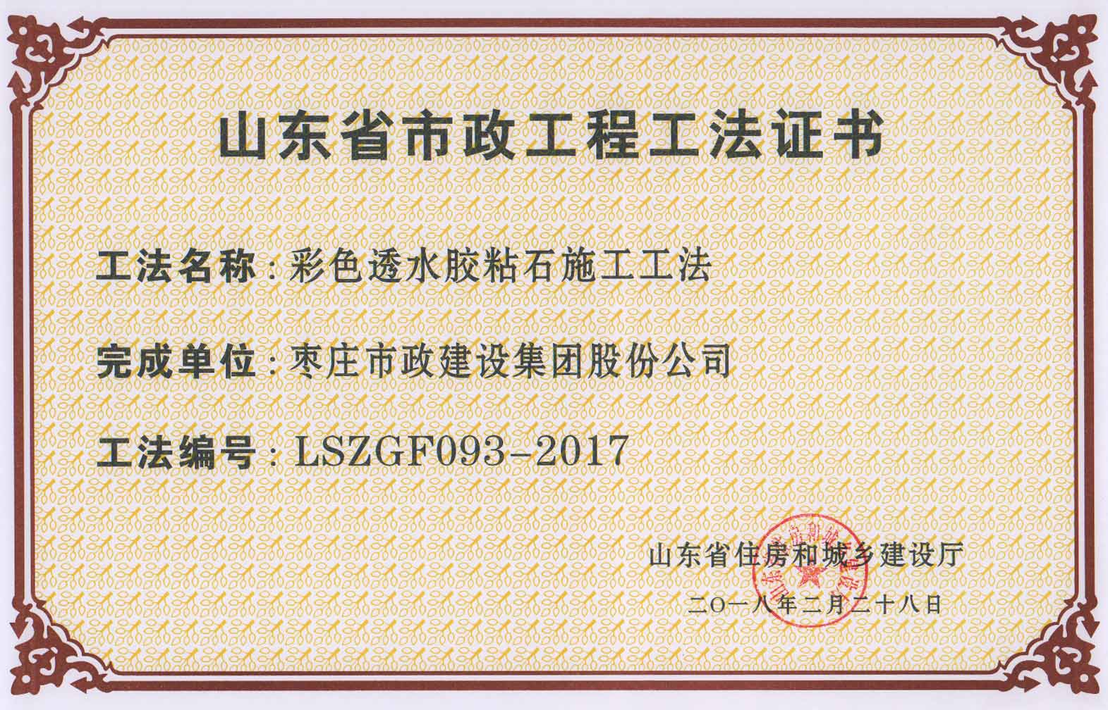 日前,由我公司編制的《彩色透水膠粘石施工工法》、《直埋電纜防盜器施工工法》、《透水磚增強找平層施工工法》獲評“2017年度山東省市政工程工法”。同時,我公司施工的棗莊市體育中心體育場西側(cè)室外市政工程和棗莊市市中區(qū)青檀路改造工程獲評“山東省市政基礎(chǔ)設(shè)施工程安全文明工地”。此次全省共有154個工法、160個項目經(jīng)過專家評審和檢查,最終分別獲得上述兩項榮譽。