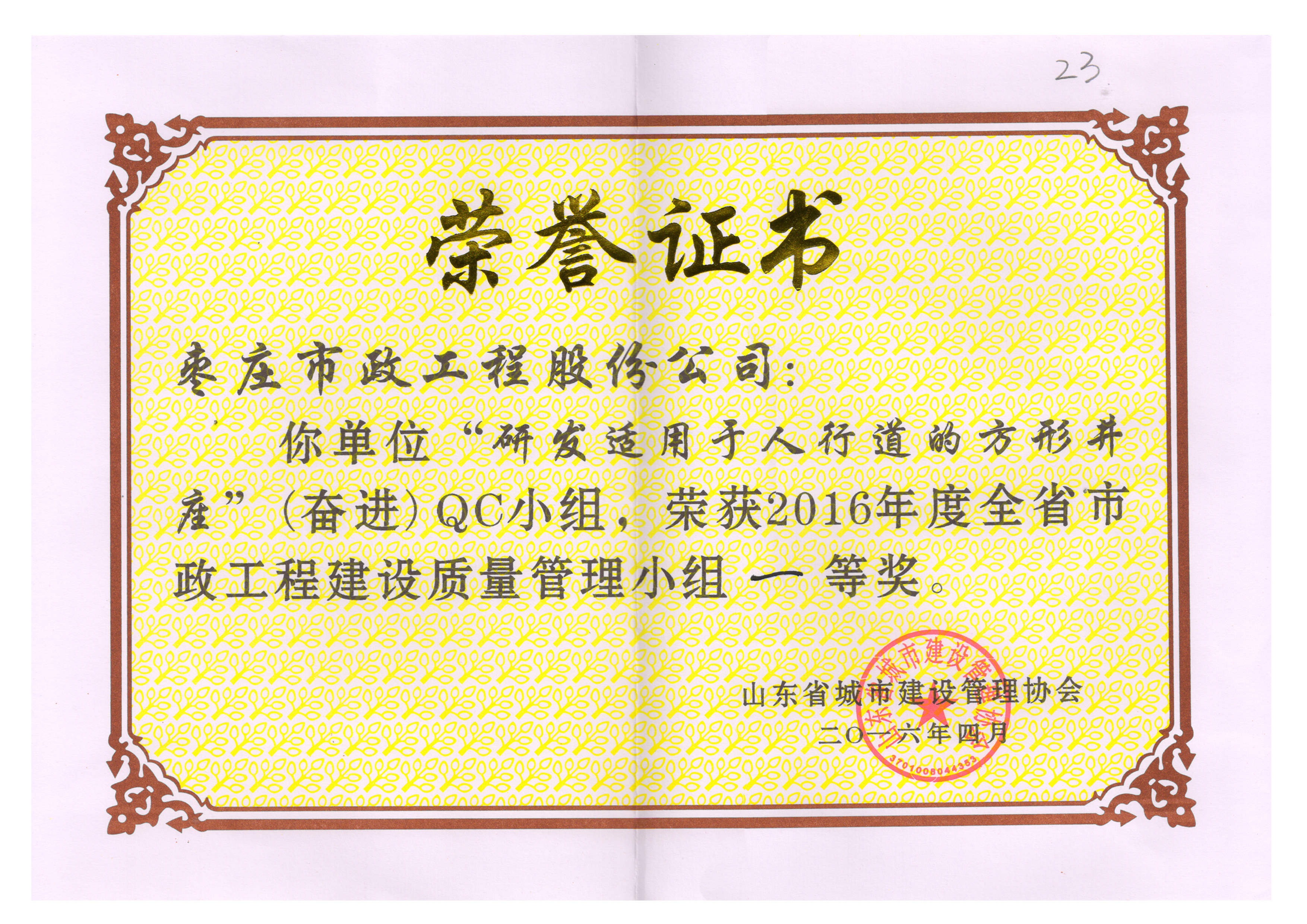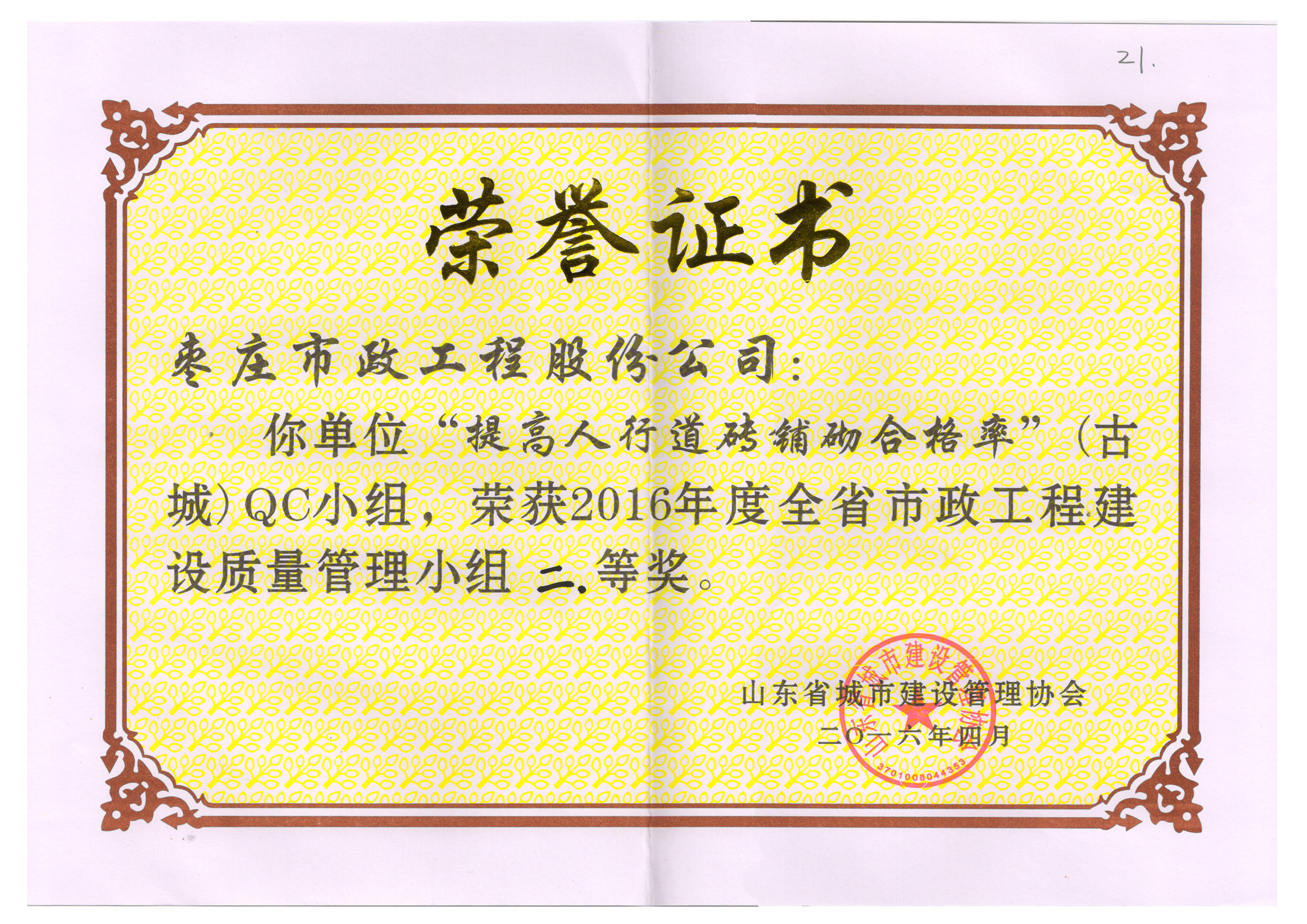 4月22日,由姚洪晉副總經理帶隊,路橋一公司奮進QC小組、路橋二公司古城QC小組參加了2016年全省QC成果發布會。一公司申報的“研發適用于人行道的方形井座”和二公司申報的“提高人行道磚鋪砌合格率”兩項QC成果,分別榮獲2016年度全省市政工程建設質量管理小組一、二等獎。